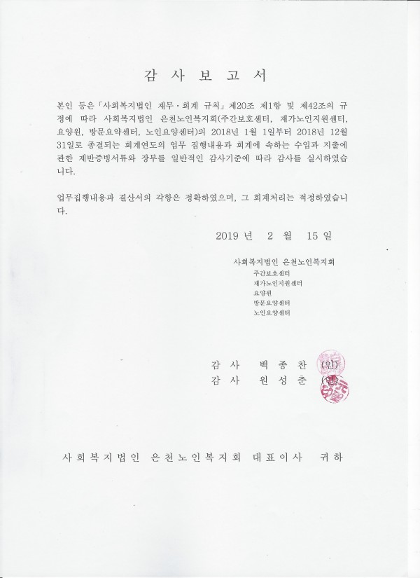 2018년 법인회계감사 보고서 페이지 정보 작성자 은천노인복지회 작성일19-02-27 14:31 조회139,176회 댓글0건 관련링크 이전글 다음글 목록 답변 본문 2018년 법인회계감사 보고서입니다. 이전글 다음글 목록 답변
