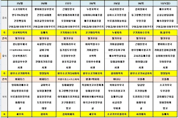 11월넷째주식단표 페이지 정보 작성자 은천노인복지회 작성일19-11-27 09:21 조회38,491회 댓글0건 관련링크 이전글 다음글 목록 답변 본문 ※ 모든 식사에는 잡곡밥과 김치가 제공됩니다. ※ 식단은 식재료수급에 의해 변경될 수 있습니다. 이전글 다음글 목록 답변