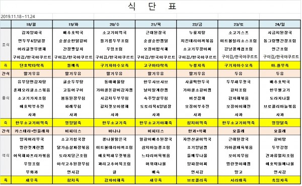 11월 셋째주 식단표 페이지 정보 작성자 은천노인복지회 작성일19-11-15 14:42 조회39,339회 댓글0건 관련링크 이전글 다음글 목록 답변 본문 ※ 모든 식사에는 잡곡밥과 김치가 제공됩니다. ※ 식단은 식재료수급에 의해 변경될 수 있습니다. 이전글 다음글 목록 답변