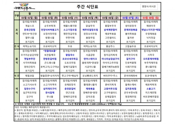 3월 첫째주 식단표 페이지 정보 작성자 은천노인복지회 작성일26-02-27 13:13 조회204회 댓글0건 관련링크 다음글 목록 답변 본문 2월 넷째주 어르신 식단표 안내해 드립니다. 정성과 영양을 담아 준비하겠습니다. 다음글 목록 답변