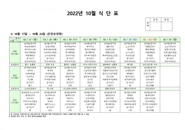 10월 셋째주 식단표 페이지 정보 작성자 은천노인복지회 작성일22-10-13 17:30 조회91,312회 댓글0건 관련링크 이전글 다음글 목록 답변 본문 . 이전글 다음글 목록 답변
