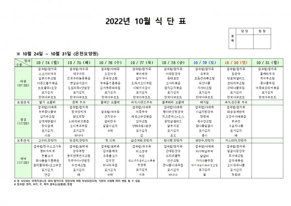 10월 넷째주 식단표 페이지 정보 작성자 은천노인복지회 작성일22-10-20 15:06 조회90,422회 댓글0건 관련링크 이전글 다음글 목록 답변 본문 . 이전글 다음글 목록 답변