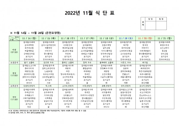 11월 셋째주 식단표 페이지 정보 작성자 은천노인복지회 작성일22-11-10 10:10 조회88,125회 댓글0건 관련링크 이전글 다음글 목록 답변 본문 . 이전글 다음글 목록 답변