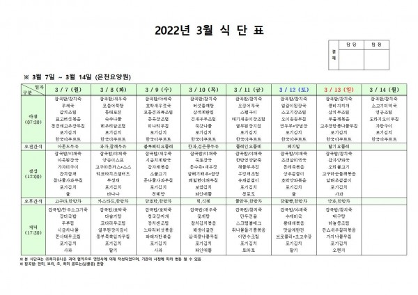 3월 둘째주 식단표 페이지 정보 작성자 은천노인복지회 작성일22-03-04 09:58 조회111,334회 댓글0건 관련링크 이전글 다음글 목록 답변 본문 . 이전글 다음글 목록 답변