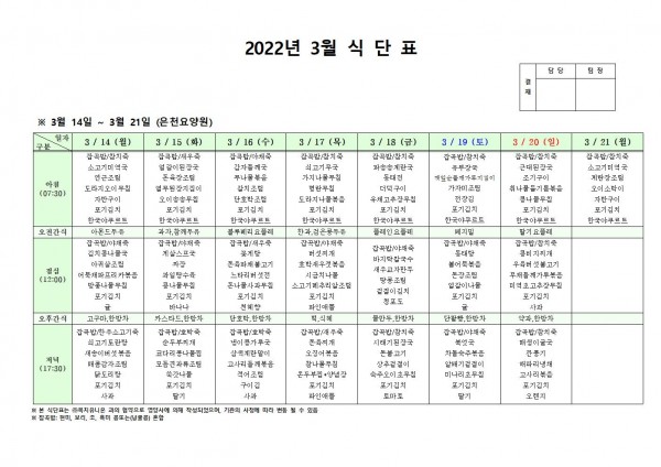3월 셋째주 식단표 페이지 정보 작성자 은천노인복지회 작성일22-03-11 16:43 조회111,321회 댓글0건 관련링크 이전글 다음글 목록 답변 본문 . 이전글 다음글 목록 답변