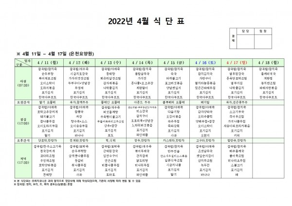 4월 둘째주 식단표 페이지 정보 작성자 은천노인복지회 작성일22-04-11 16:27 조회108,082회 댓글0건 관련링크 이전글 다음글 목록 답변 본문 . 이전글 다음글 목록 답변