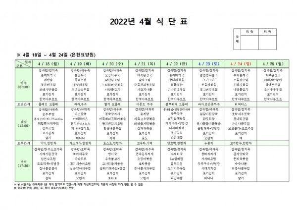 4월 셋째주 식단표 페이지 정보 작성자 은천노인복지회 작성일22-04-14 17:03 조회106,684회 댓글0건 관련링크 이전글 다음글 목록 답변 본문 . 이전글 다음글 목록 답변