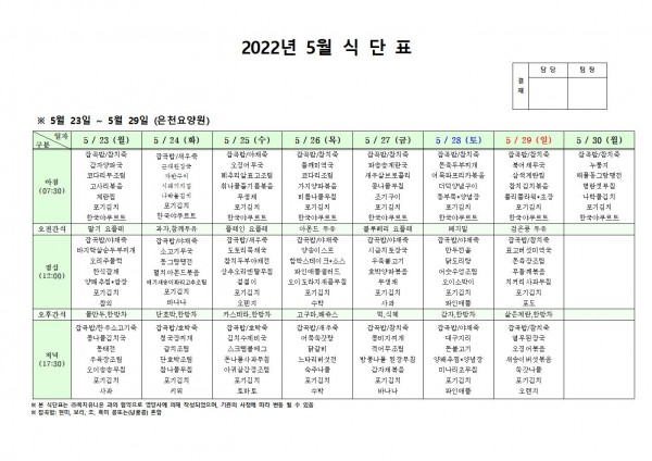 5월 넷째주 식단표 페이지 정보 작성자 은천노인복지회 작성일22-05-19 16:56 조회102,437회 댓글0건 관련링크 이전글 다음글 목록 답변 본문 . 이전글 다음글 목록 답변