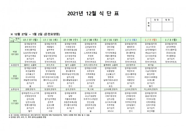 12월 다섯째주 식단표 페이지 정보 작성자 은천노인복지회 작성일21-12-23 17:14 조회119,175회 댓글0건 관련링크 이전글 다음글 목록 답변 본문 . 이전글 다음글 목록 답변