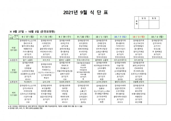 9월 넷째주 식단표 페이지 정보 작성자 은천노인복지회 작성일21-09-30 16:00 조회124,383회 댓글0건 관련링크 이전글 다음글 목록 답변 본문 . 이전글 다음글 목록 답변