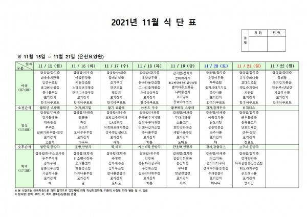 11월 셋째주 식단표 페이지 정보 작성자 은천노인복지회 작성일21-11-25 17:11 조회122,534회 댓글0건 관련링크 이전글 다음글 목록 답변 본문 . 이전글 다음글 목록 답변