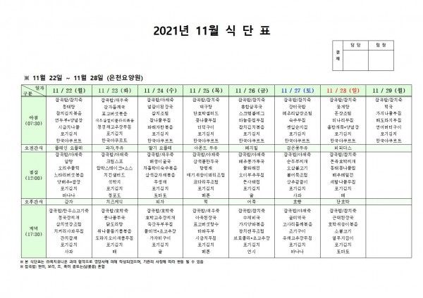 11월 넷째주 식단표 페이지 정보 작성자 은천노인복지회 작성일21-11-25 17:12 조회122,004회 댓글0건 관련링크 이전글 다음글 목록 답변 본문 . 이전글 다음글 목록 답변