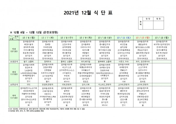 12월 둘째주 식단표 페이지 정보 작성자 은천노인복지회 작성일21-12-03 10:52 조회120,114회 댓글0건 관련링크 이전글 다음글 목록 답변 본문 . 이전글 다음글 목록 답변