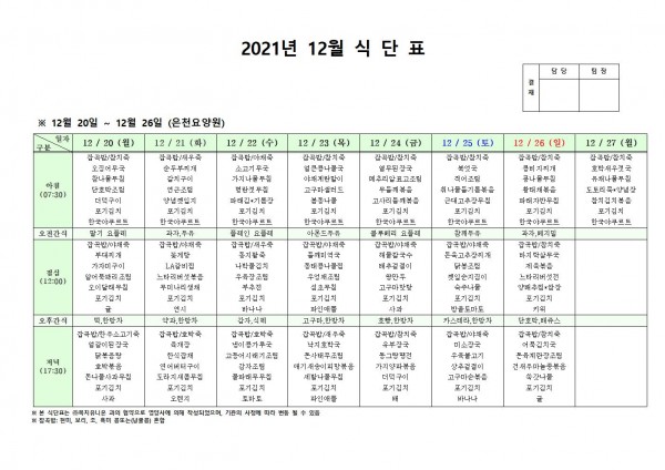 12월 넷째주 식단표 페이지 정보 작성자 은천노인복지회 작성일21-12-16 17:24 조회118,856회 댓글0건 관련링크 이전글 다음글 목록 답변 본문 . 이전글 다음글 목록 답변