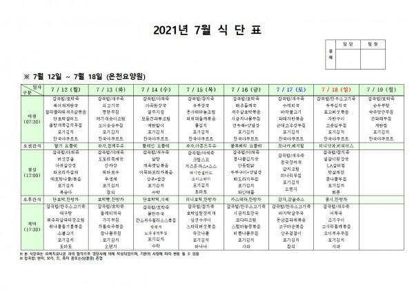 7월 둘째주 식단표 페이지 정보 작성자 은천노인복지회 작성일21-07-22 11:18 조회129,622회 댓글0건 관련링크 이전글 다음글 목록 답변 본문 . 이전글 다음글 목록 답변