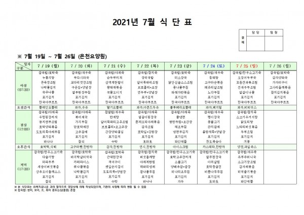 7월 셋째주 식단표 페이지 정보 작성자 은천노인복지회 작성일21-07-22 11:18 조회129,328회 댓글0건 관련링크 이전글 다음글 목록 답변 본문 . 이전글 다음글 목록 답변