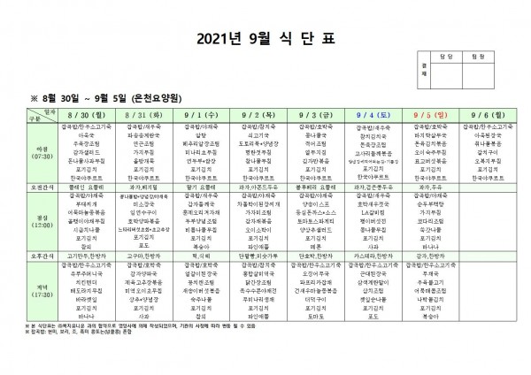 9월 첫째주 식단표 페이지 정보 작성자 은천노인복지회 작성일21-08-26 17:14 조회125,628회 댓글0건 관련링크 이전글 다음글 목록 답변 본문 . 이전글 다음글 목록 답변