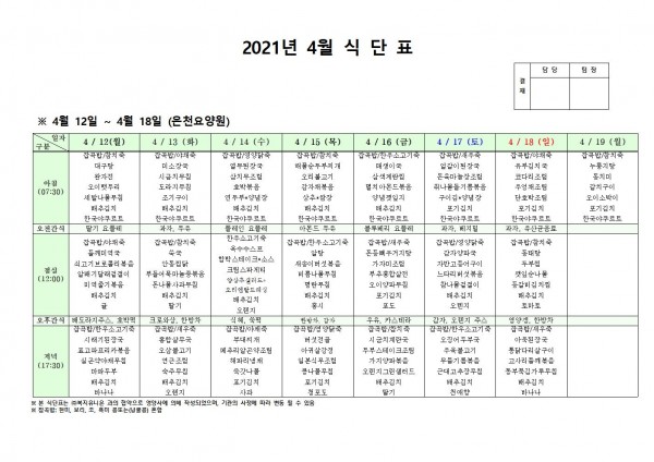 4월 둘째주 식단표 페이지 정보 작성자 은천노인복지회 작성일21-04-08 19:12 조회136,537회 댓글0건 관련링크 이전글 다음글 목록 답변 본문 4월 둘째주 식단표 이전글 다음글 목록 답변