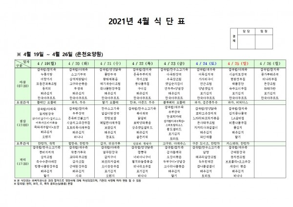 4월 셋째주 식단표 페이지 정보 작성자 은천노인복지회 작성일21-04-15 19:35 조회136,969회 댓글0건 관련링크 이전글 다음글 목록 답변 본문 4월 셋째주 식단표 이전글 다음글 목록 답변