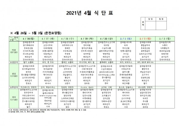 4월 넷째주 식단표 페이지 정보 작성자 은천노인복지회 작성일21-04-22 18:32 조회134,977회 댓글0건 관련링크 이전글 다음글 목록 답변 본문 식단표 이전글 다음글 목록 답변
