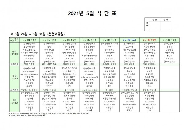 5월 넷째 주 식단표 페이지 정보 작성자 은천노인복지회 작성일21-05-21 16:38 조회132,482회 댓글0건 관련링크 이전글 다음글 목록 답변 본문 5월 넷째 주 식단표 이전글 다음글 목록 답변
