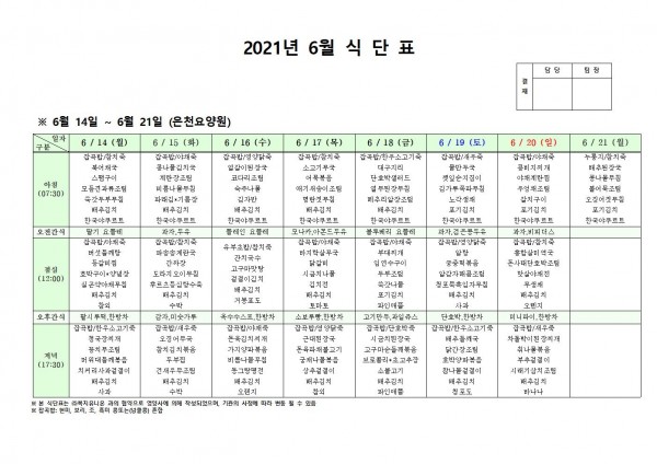 6월 셋째주 식단표 페이지 정보 작성자 은천노인복지회 작성일21-06-11 10:28 조회130,799회 댓글0건 관련링크 이전글 다음글 목록 답변 본문 . 이전글 다음글 목록 답변