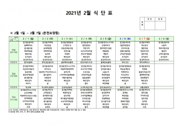 2월 첫째주 식단표 페이지 정보 작성자 은천노인복지회 작성일21-01-28 17:45 조회144,968회 댓글0건 관련링크 이전글 다음글 목록 답변 본문 . 이전글 다음글 목록 답변