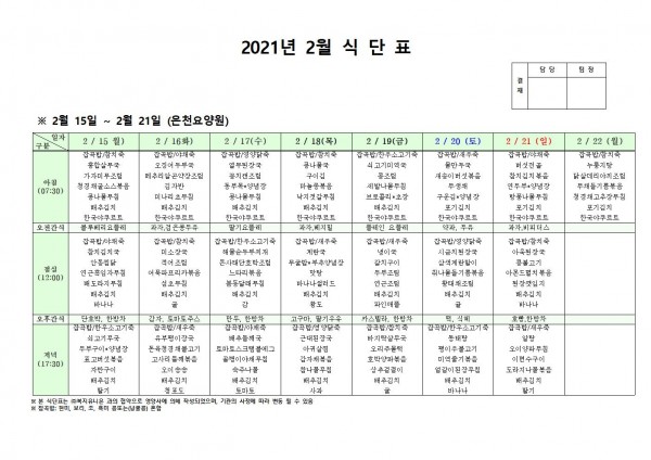 2월 셋째주 식단표 페이지 정보 작성자 은천노인복지회 작성일21-02-15 14:12 조회143,505회 댓글0건 관련링크 이전글 다음글 목록 답변 본문 2월 식단표 [이 게시물은 은천노인복지회님에 의해 2021-03-12 17:18:24 공지사항에서 이동 됨] 이전글 다음글 목록 답변