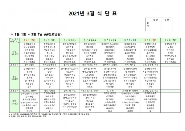 3월 첫째주 식단표 페이지 정보 작성자 은천노인복지회 작성일21-02-25 16:45 조회141,869회 댓글0건 관련링크 이전글 다음글 목록 답변 본문 식단표 [이 게시물은 은천노인복지회님에 의해 2021-03-12 17:18:24 공지사항에서 이동 됨] 이전글 다음글 목록 답변