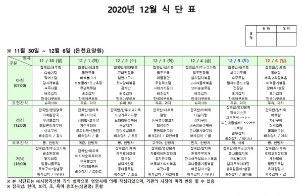 12월 첫째주 식단표 페이지 정보 작성자 은천노인복지회 작성일20-12-08 18:10 조회150,578회 댓글0건 관련링크 이전글 다음글 목록 답변 본문 . 이전글 다음글 목록 답변