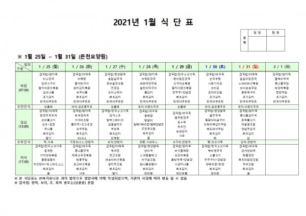 1월 넷째주 식단표 페이지 정보 작성자 은천노인복지회 작성일21-01-22 10:43 조회145,226회 댓글0건 관련링크 이전글 다음글 목록 답변 본문 . 이전글 다음글 목록 답변