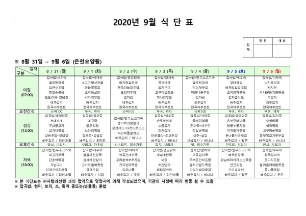 9월 첫째주 식단표 페이지 정보 작성자 은천노인복지회 작성일20-09-07 14:40 조회159,368회 댓글0건 관련링크 이전글 다음글 목록 답변 본문 * 이전글 다음글 목록 답변