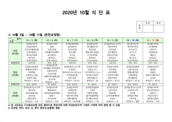 10월 둘째주 식단표 페이지 정보 작성자 은천노인복지회 작성일20-10-12 14:45 조회157,159회 댓글0건 관련링크 이전글 다음글 목록 답변 본문 . 이전글 다음글 목록 답변