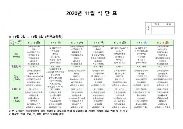 11월 첫째주 식단표 페이지 정보 작성자 은천노인복지회 작성일20-11-13 13:47 조회153,405회 댓글0건 관련링크 이전글 다음글 목록 답변 본문 . 이전글 다음글 목록 답변