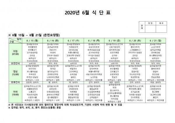 6월 셋째주 식단표 페이지 정보 작성자 은천노인복지회 작성일20-06-22 16:16 조회165,916회 댓글0건 관련링크 이전글 다음글 목록 답변 본문 . 이전글 다음글 목록 답변