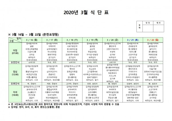 3월 셋째주 식단표 페이지 정보 작성자 은천노인복지회 작성일20-03-23 14:50 조회177,162회 댓글0건 관련링크 이전글 다음글 목록 답변 본문 . 이전글 다음글 목록 답변