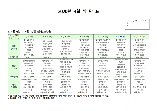 4월 첫째주 식단표 페이지 정보 작성자 은천노인복지회 작성일20-04-13 15:04 조회175,156회 댓글0건 관련링크 이전글 다음글 목록 답변 본문 . 이전글 다음글 목록 답변