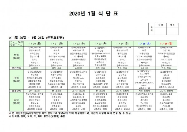 1월 셋째주 식단표 페이지 정보 작성자 은천노인복지회 작성일20-01-28 14:25 조회181,982회 댓글0건 관련링크 이전글 다음글 목록 답변 본문 1월 셋째주 식단표입니다. 이전글 다음글 목록 답변