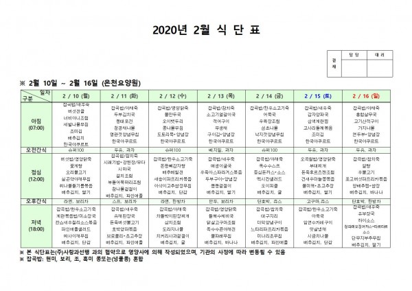 2월 둘째주 식단표 페이지 정보 작성자 은천노인복지회 작성일20-02-17 10:27 조회178,365회 댓글0건 관련링크 이전글 다음글 목록 답변 본문 ㅇㅅㅇ 이전글 다음글 목록 답변