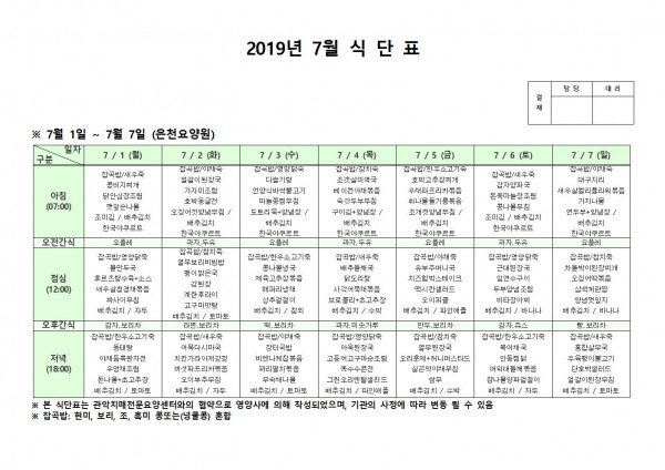 7월 첫째주 식단표 페이지 정보 작성자 은천노인복지회 작성일19-07-08 11:21 조회196,387회 댓글0건 관련링크 이전글 다음글 목록 답변 본문 7월 첫째주 식단표 이전글 다음글 목록 답변
