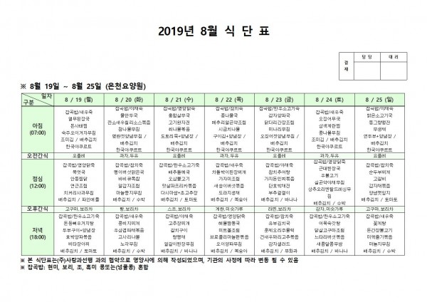 8월 넷째주 식단표 페이지 정보 작성자 은천노인복지회 작성일19-08-26 16:38 조회192,240회 댓글0건 관련링크 이전글 다음글 목록 답변 본문 8월 넷째주 식단표 이전글 다음글 목록 답변