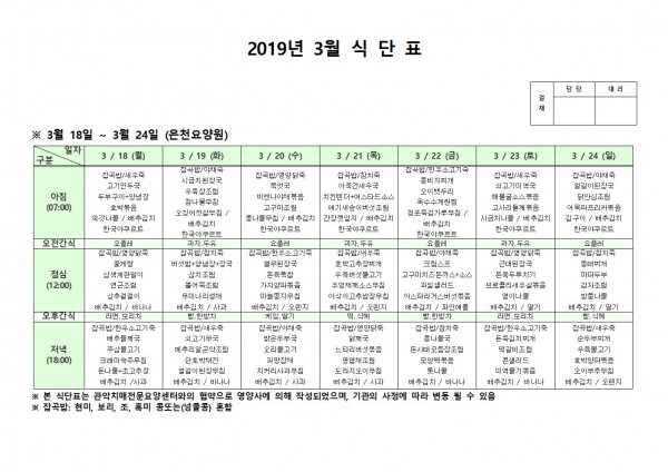 3월 셋째주 식단표 페이지 정보 작성자 은천노인복지회 작성일19-03-25 11:11 조회201,873회 댓글0건 관련링크 이전글 다음글 목록 답변 본문 3월 셋째주 식단표 이전글 다음글 목록 답변