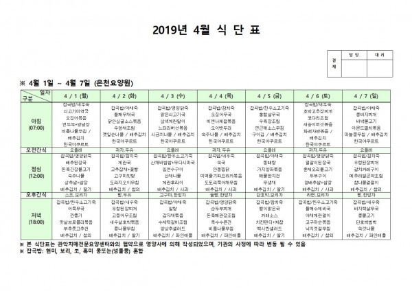 4월 첫째주 식단표 페이지 정보 작성자 은천노인복지회 작성일19-04-08 11:56 조회202,410회 댓글0건 관련링크 이전글 다음글 목록 답변 본문 4월 첫째주 식단표 이전글 다음글 목록 답변