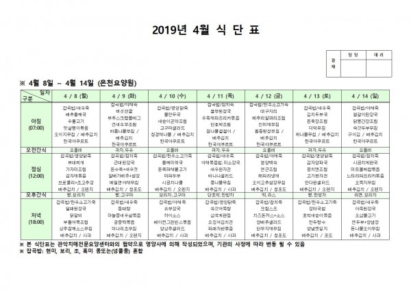 4월 둘째주 식단표 페이지 정보 작성자 은천노인복지회 작성일19-04-16 09:48 조회202,167회 댓글0건 관련링크 이전글 다음글 목록 답변 본문 4월 둘째주 식단표 이전글 다음글 목록 답변