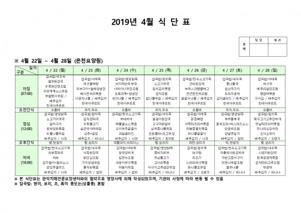4월 넷째주 식단표 페이지 정보 작성자 은천노인복지회 작성일19-04-29 10:14 조회202,679회 댓글0건 관련링크 이전글 다음글 목록 답변 본문 4월 넷째주 식단표 이전글 다음글 목록 답변
