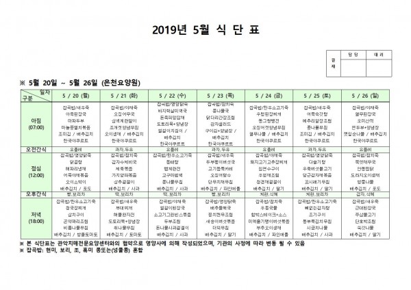 5월 셋째주 식단표 페이지 정보 작성자 은천노인복지회 작성일19-05-27 14:07 조회199,378회 댓글0건 관련링크 이전글 다음글 목록 답변 본문 5월 셋째주 식단표 이전글 다음글 목록 답변