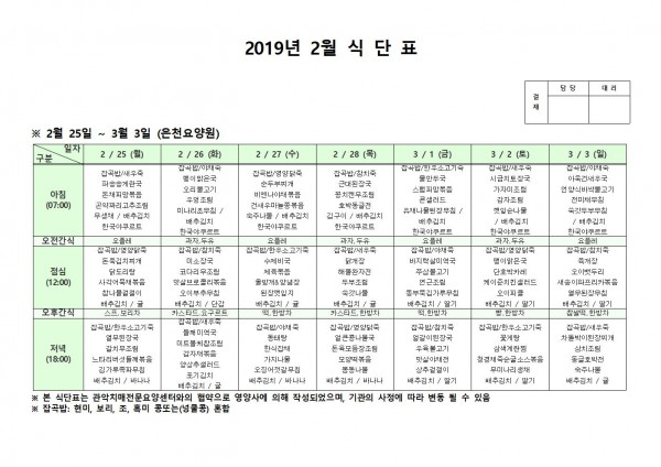 2월 넷째주 식단표 페이지 정보 작성자 은천노인복지회 작성일19-03-04 15:48 조회202,832회 댓글0건 관련링크 이전글 다음글 목록 답변 본문 2월 넷째주 식단표 이전글 다음글 목록 답변