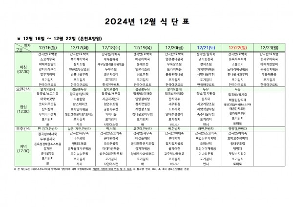 12월 셋째주 식단표 페이지 정보 작성자 은천노인복지회 작성일24-12-13 09:36 조회16,477회 댓글0건 관련링크 이전글 다음글 목록 답변 본문 . 이전글 다음글 목록 답변