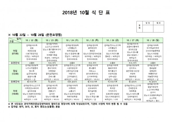 10월 넷째주 식단표 페이지 정보 작성자 은천노인복지회 작성일18-10-30 09:49 조회203,290회 댓글0건 관련링크 이전글 다음글 목록 답변 본문 10월 넷째주 식단표 이전글 다음글 목록 답변