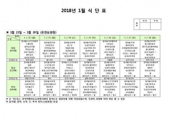 1월 넷째주 식단표 페이지 정보 작성자 은천노인복지회 작성일18-01-24 11:07 조회192,528회 댓글0건 관련링크 이전글 다음글 목록 답변 본문 1월 넷째주 식단표 이전글 다음글 목록 답변